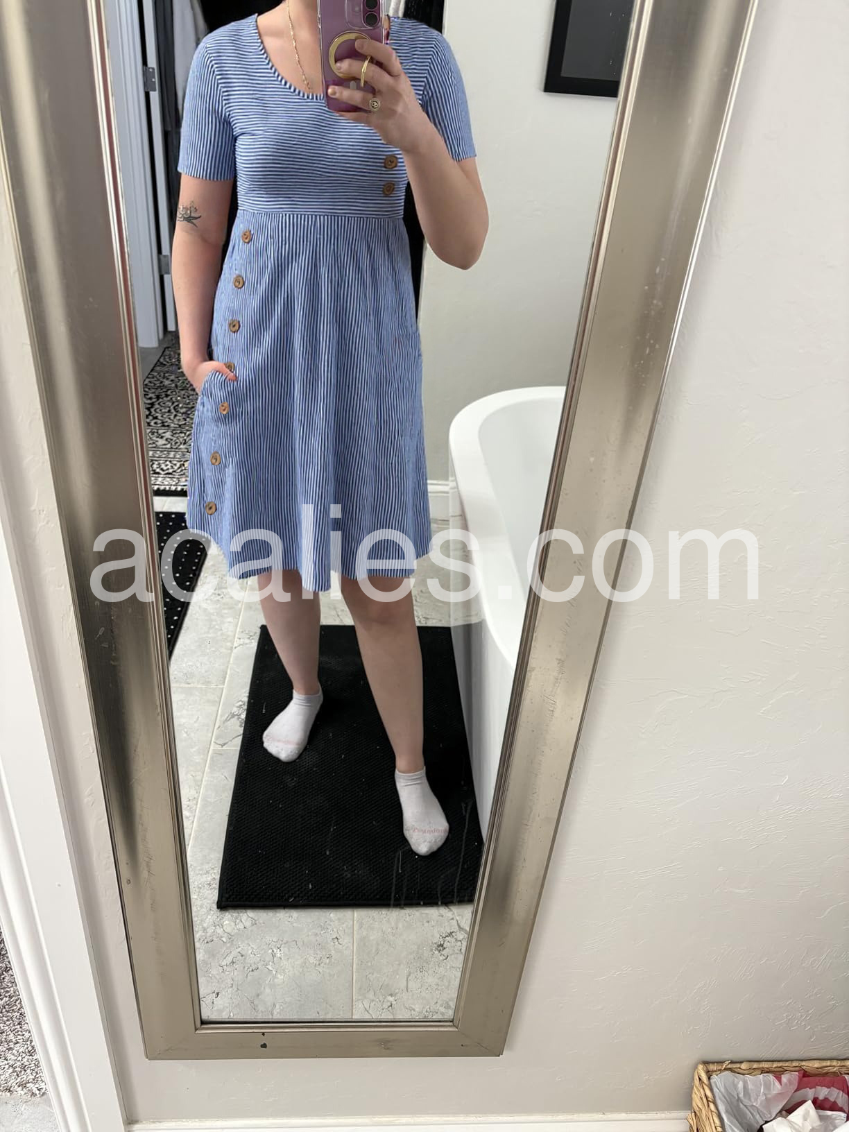 This dress is absolutely perfect! The blue and white stripes are so classic and the buttons add a nice touch.