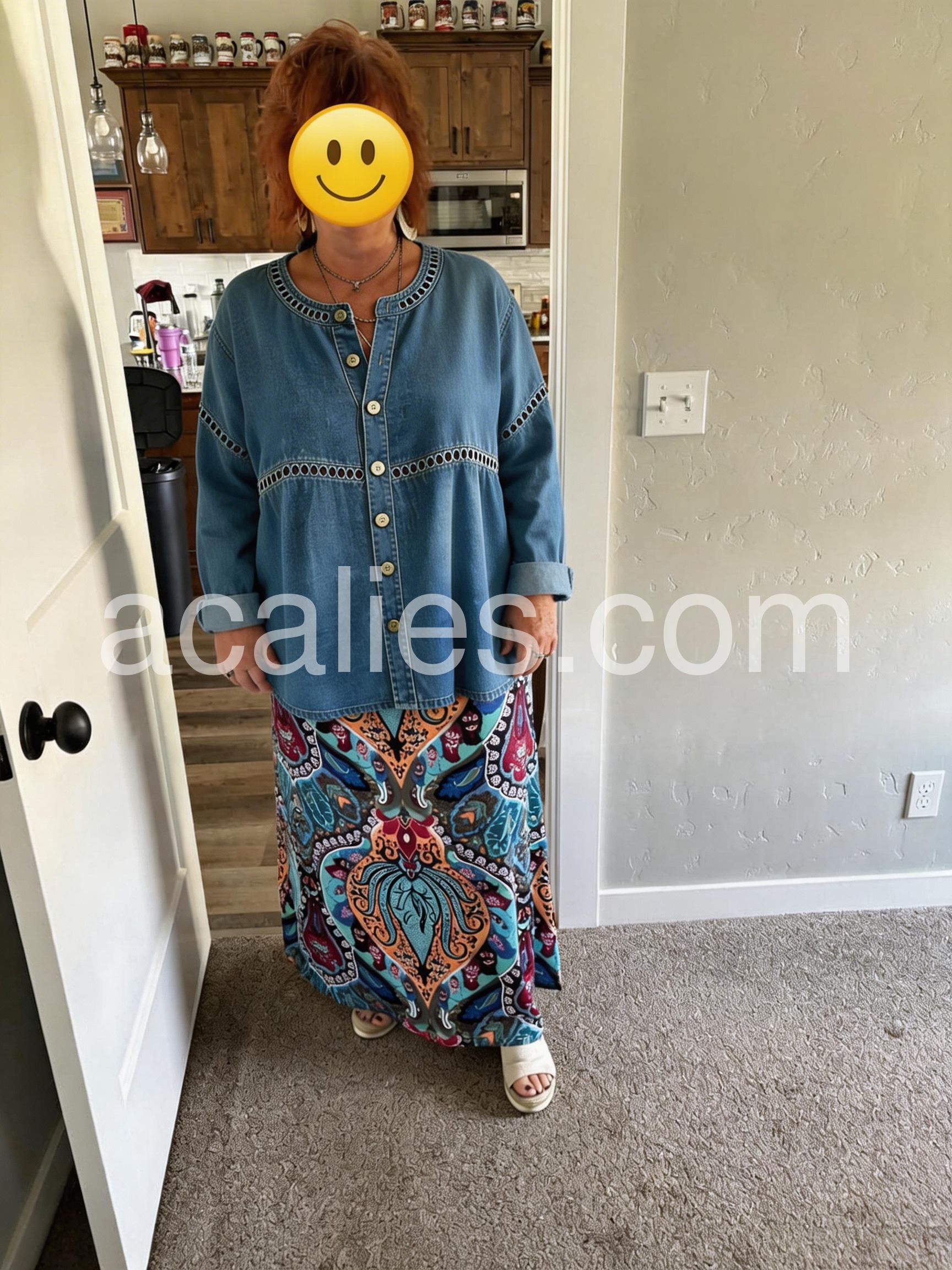 Embrace laid-back elegance in this Blue Denim Button Down Top with Embroidered Trim, a stylish and comfortable piece that blends classic denim appeal with artisanal details. Crafted from soft, medium-wash denim fabric, this tunic features a relaxed, oversized silhouette with a flattering round neckline and front button closure, offering both ease and timeless charm. The standout design element is the decorative embroidered trim—featuring a delicate dotted pattern—accenting the neckline and waistline, adding a touch of boho flair and texture. Styled here with layered necklaces, bracelets, and distressed denim bottoms, it’s ideal for weekend errands, coffee dates, or a leisurely walk through the city.