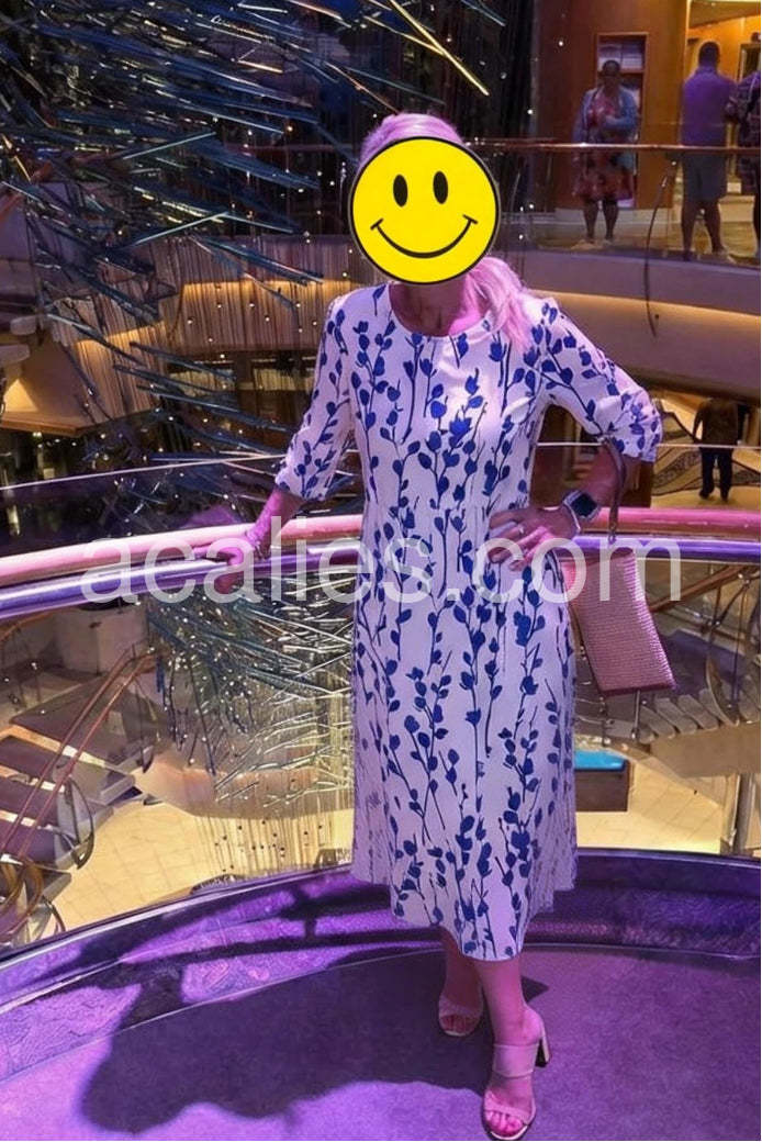 Embrace the serenity of seaside living in this Coastal Blue Botanical Print Midi Dress, a dreamy and elegant piece that captures the essence of Mediterranean charm. Crafted from lightweight, breathable fabric—likely cotton or linen blend—this midi dress features a crisp white base adorned with a delicate all-over print of navy blue leafy vines and botanical sprigs, evoking the beauty of coastal flora. The relaxed A-line silhouette flatters every figure, while the high waist and gentle gathering create a soft, flowing shape that moves gracefully with you. Short sleeves and a round neckline offer timeless comfort and ease, perfect for warm days by the sea. Designed with functional side pockets, it’s both stylish and practical—ideal for strolls through whitewashed villages, beachside brunches, or summer vacations.