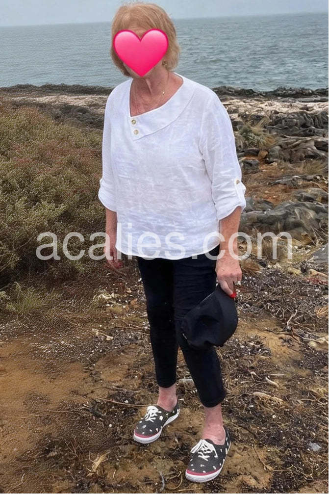 Elevate your everyday style with this Minimalist White Button-Trimmed Blouse, a clean and sophisticated piece that blends simplicity with subtle detail. Crafted from soft, breathable linen-like fabric, this long-sleeve top features an elegant asymmetrical collar that drapes gracefully over the chest, secured with two delicate gold-tone buttons for a touch of understated luxury. The sleeves are finished with matching button cuffs, allowing you to roll them up for a relaxed look or keep them down for a polished silhouette. Designed with a relaxed fit and a slightly curved hem, it pairs beautifully with jeans, high-waisted pants, or skirts—perfect for casual outings, brunch dates, or office wear. Inspired by the curated, minimalist-chic styles found on Lulus.com, this blouse brings effortless elegance to any outfit. Whether dressed up with heels or worn casually with sneakers, it’s a versatile wardrobe staple that celebrates timeless design and comfort. A must-have for women who love clean lines, neutral tones, and refined details.