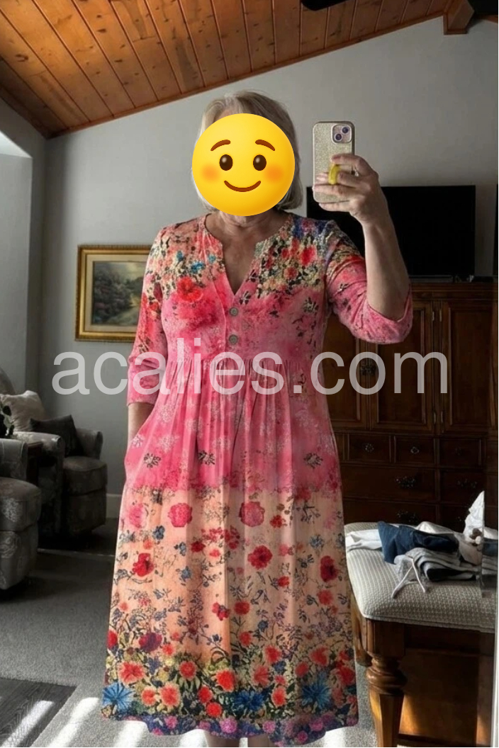 This midi dress features a vibrant floral print with a soft pink gradient and bold blooms. The V-neckline and three-quarter sleeves offer a flattering, relaxed fit. Side pockets add practicality and ease. Flowy A-line silhouette enhances movement. Perfect for garden parties or casual summer days.