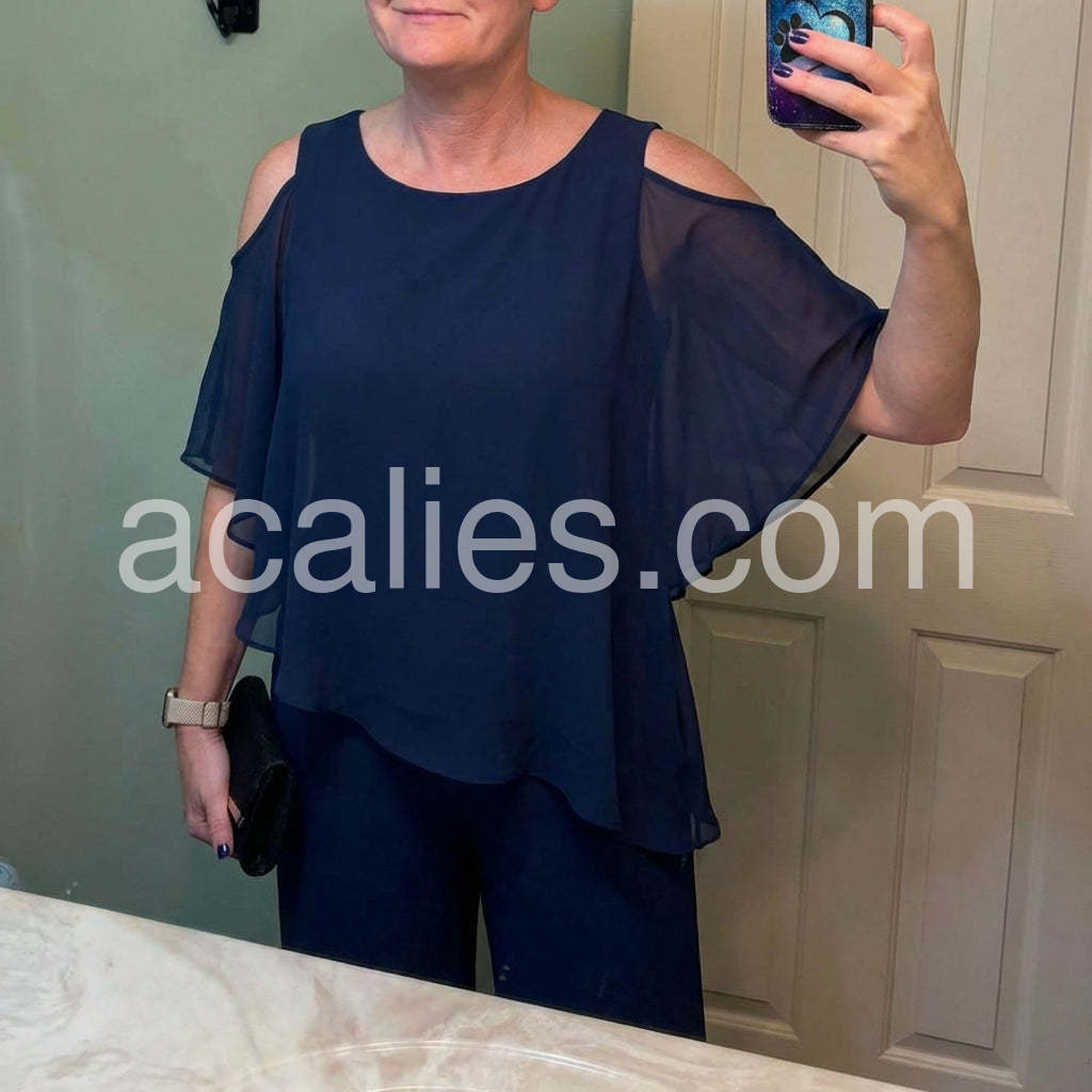 This fashionable two-piece set includes a navy cold shoulder three-quarter length draped sleeves and asymmetrically layered ruffled top and pants. Crafted from lightweight and soft materials, this set is perfect for any occasion. Step up your look with this stylish set.