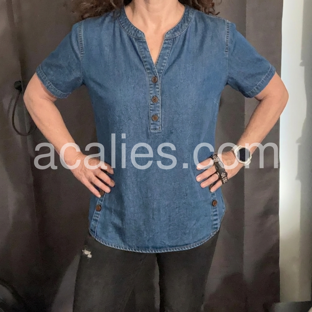 This denim-inspired top features a soft, textured fabric with subtle embossed patterns for added depth. The short sleeves and V-neckline with button detailing create a classic, flattering look. Side buttons add a unique touch and enhance the relaxed silhouette. Perfect for casual days or layered outfits. Pair with jeans or white pants for a fresh, effortless style.
