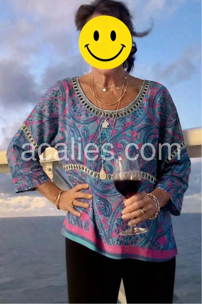 Embrace free-spirited fashion with this Special Paisley Print Round Neck Top, a bold and artistic statement piece that brings vibrant energy to any outfit. Crafted from soft, lightweight fabric—likely cotton or rayon blend—this relaxed-fit tunic features an eye-catching paisley pattern in rich shades of deep purple, teal, and fuchsia, accented with intricate tribal-inspired motifs. The design is elevated by delicate black circular trim along the neckline, sleeves, and waistband, adding a touch of bohemian flair and contrast. With its three-quarter sleeves and slightly asymmetrical hem, this top drapes beautifully over jeans, leggings, or skirts, making it perfect for casual outings, music festivals, or weekend adventures. Layer it with layered necklaces, bracelets, and sandals for a full-on boho look—just like in this Lulus-inspired ensemble. Ideal for those who love expressive prints and effortless style, this tunic combines comfort, color, and cultural artistry into one wearable masterpiece. A must-have for anyone craving a touch of wanderlust in their wardrobe.