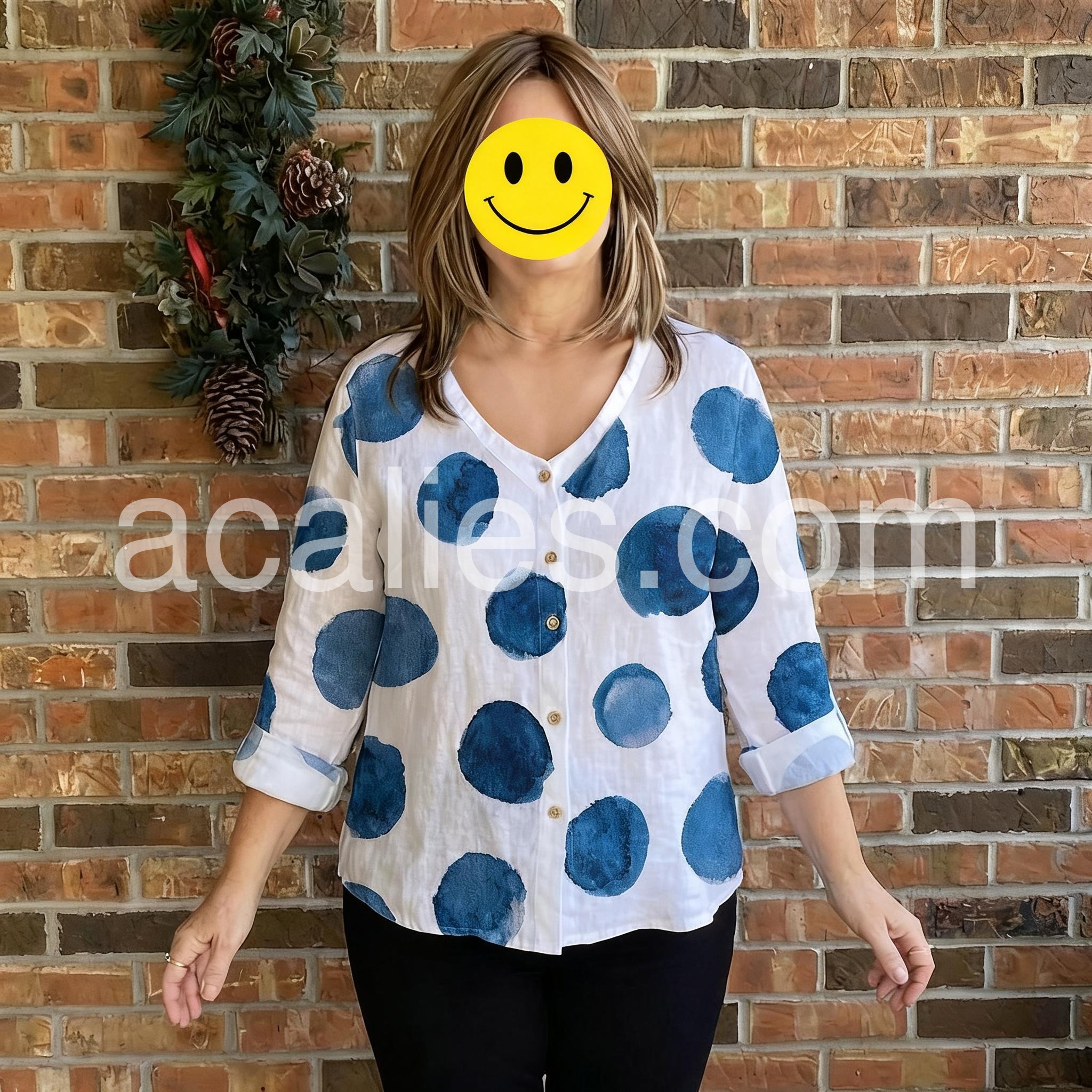 This button-down blouse features a playful watercolor polka dot print in navy blue on a crisp white background. The V-neckline and three-quarter sleeves offer a relaxed, comfortable fit. Lightweight fabric makes it perfect for everyday wear. Pair with jeans or shorts for a stylish casual look. Effortlessly trendy with a touch of artistic flair.