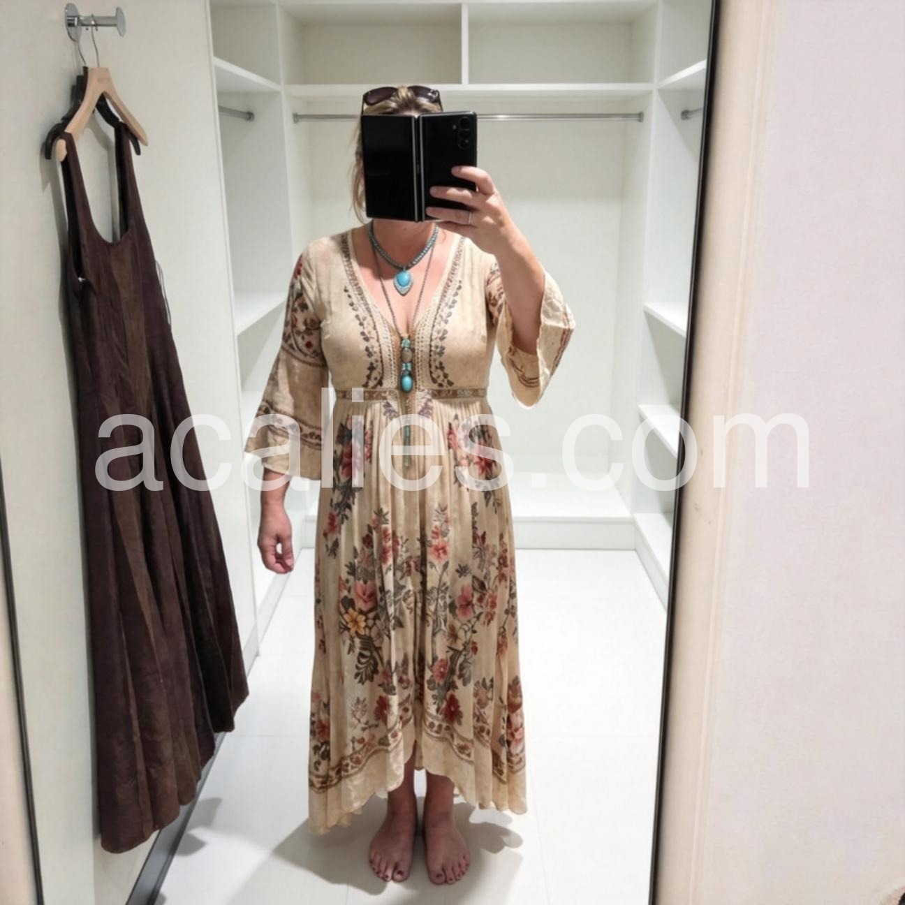 This Retro 3/4 Sleeve Beige Midi Dress combines timeless elegance with comfortable wearability. Its classic beige tone and modest midi length make it versatile for various occasions, while the 3/4 sleeves offer a balanced blend of coverage and style. Crafted to flatter a range of silhouettes, this dress is an expert choice for those seeking understated sophistication with a vintage-inspired touch.