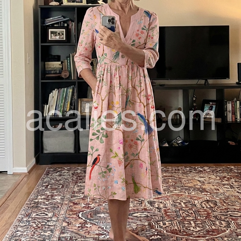 This three-quarter sleeve dress features a soft pink base with colorful birds and floral patterns. The V-neck and button front add vintage appeal. Side pockets offer comfort and convenience. Lightweight fabric perfect for spring and summer. Ideal for casual outings or garden parties.