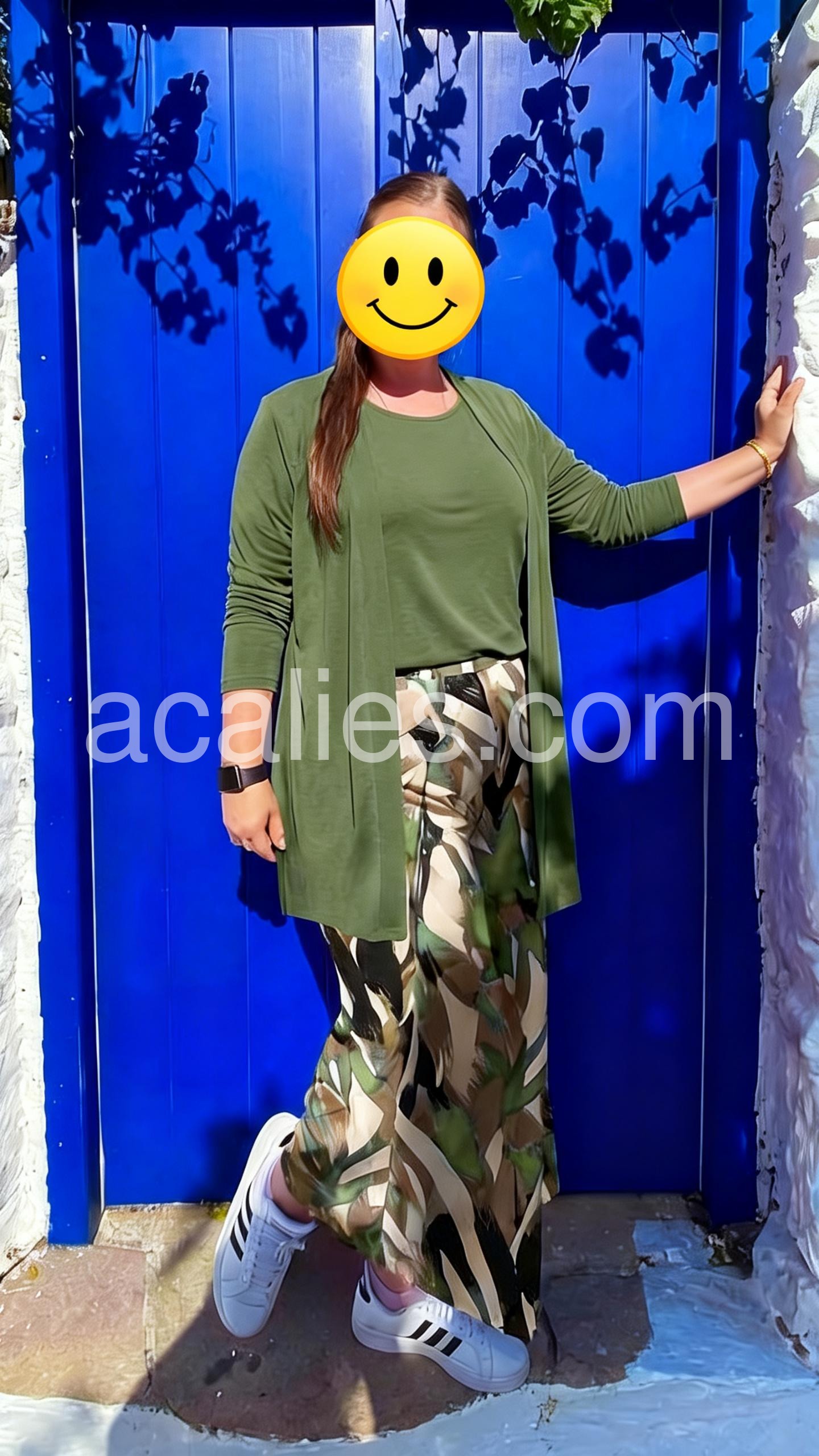 This three-piece set features a solid green top, matching open-front cardigan, and wide-leg pants with a bold tropical leaf print. The relaxed silhouette offers comfort and style. Perfect for casual outings or warm-weather wear. Lightweight fabric ideal for everyday elegance. Effortlessly chic and easy to wear.