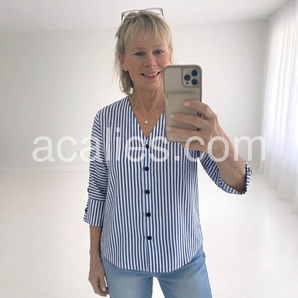 Effortless elegance meets everyday versatility in this timeless striped blouse. The flattering V-neckline draws the eye upward, while crisp vertical blue and white stripes create a refined, elongating silhouette. Crafted from a breathable cotton-elastane blend, the three-quarter sleeves feature charming side button details that elevate the design beyond the ordinary. Slip it on for weekend brunch, office meetings, or casual dinners—this piece transitions seamlessly across your week. The lightweight fabric moves with you, never constraining, always comfortable. Pair with tailored trousers for polished sophistication or your favorite jeans for relaxed chic. This is the blouse you'll reach for again and again. Make it yours today.