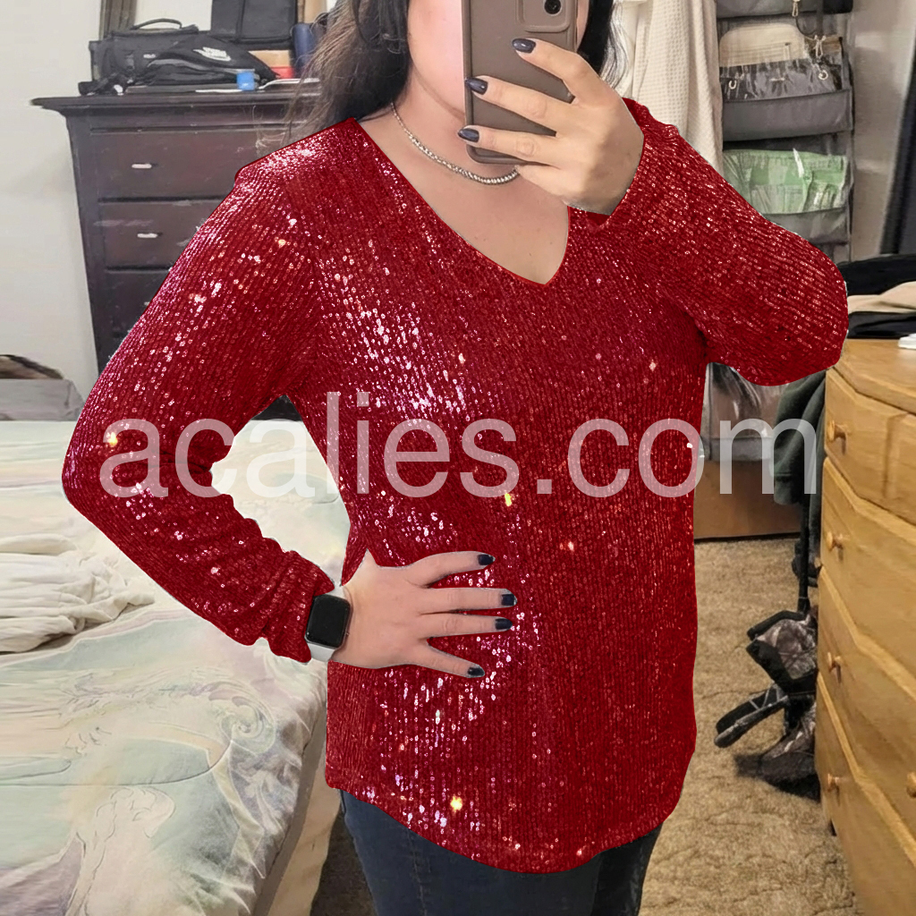 Don't miss out on this beautiful v-neck top! The intricate sequin detailing is sure to make a statement and the v-neck cut gives it a modern feel. This top is perfect for any special occasion or night out.