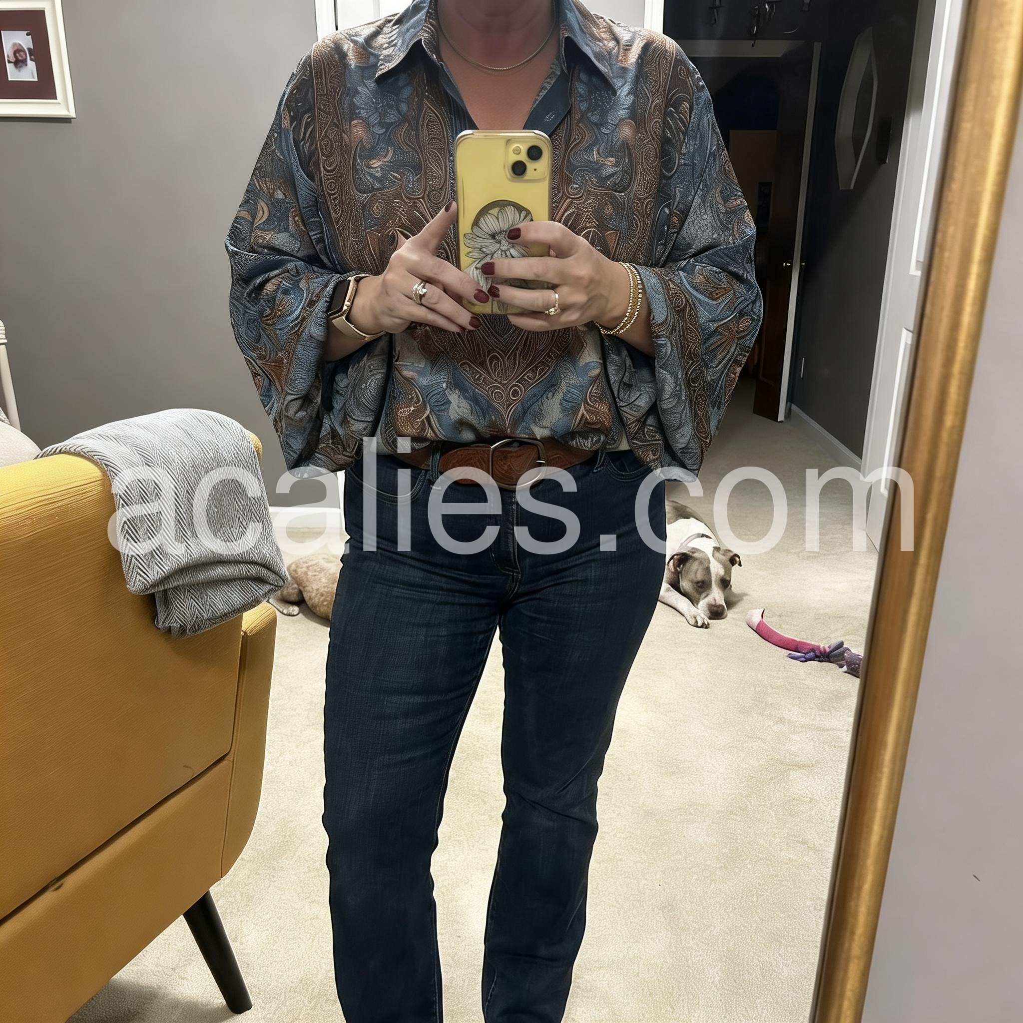Crafted from premium silk, this bohemian blouse showcases an intricate blue print that captures effortless elegance. The relaxed silhouette and flowing fabric create natural movement, making it ideal for layering or wearing solo. Perfect for transitional seasons, this versatile piece pairs seamlessly with denim, linen trousers, or skirts. The breathable silk construction ensures comfort throughout the day while maintaining a refined, polished appearance. A timeless addition to any wardrobe seeking understated sophistication with artistic flair.