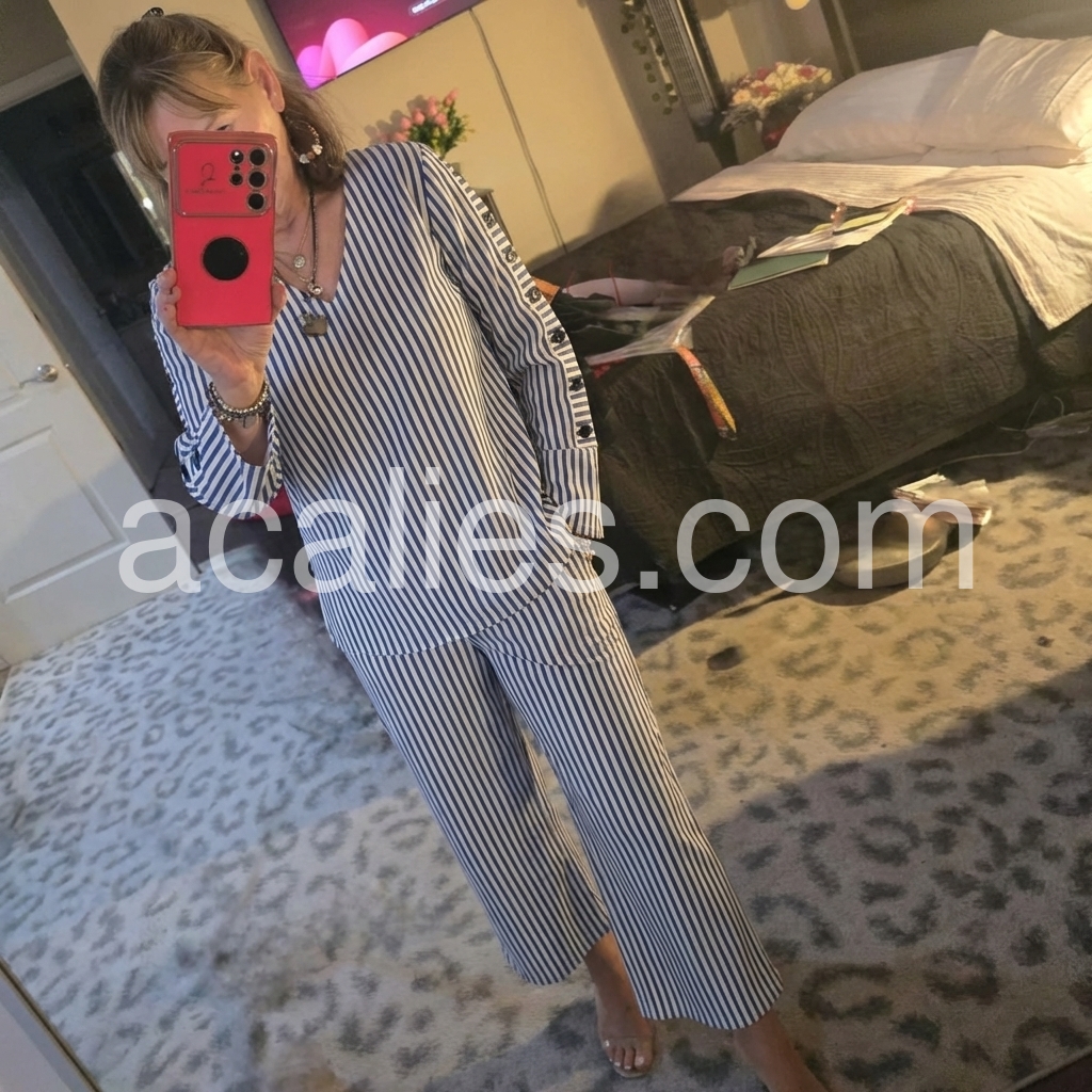 This coordinated set features a relaxed V-neck top and wide-leg cropped pants in classic blue and white stripes. The long sleeves with decorative side buttons add a stylish detail. Lightweight fabric perfect for warm weather. Ideal for casual outings or smart-casual events. Effortlessly elegant and easy to wear.
