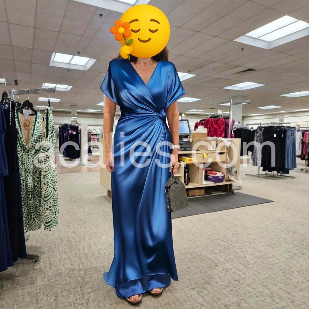 Elegant blue satin dress -- flattering knot at the waist and smooth drape. Minimal accessories with a sparkly purse elevate the look. True to size, comfy for long wear. Quick, smooth online shopping experience. Highly recommend.
